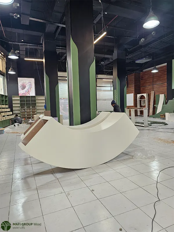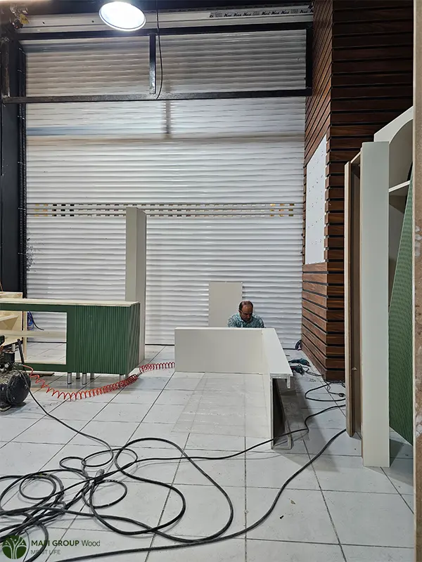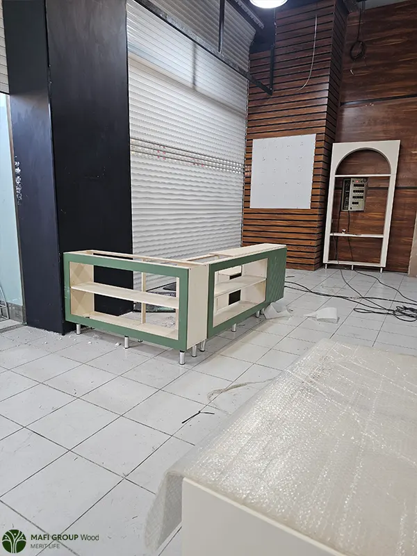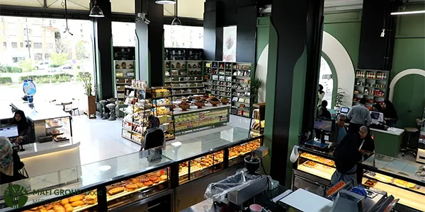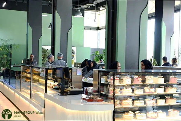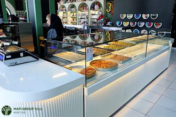 در طراحی و اجرای دکوراسیون قنادی قصر پاپلی، تیم مافی وود تلاش کرده تا ترکیبی از زیبایی، کارایی و هویت برند را در فضا به نمایش بگذارد. استفاده از متریالهای مرغوب چوب و MDF با رنگهای گرم و جذاب، حس صمیمیت و اشتها را در فضای قنادی تقویت کرده است. چیدمان دقیق ویترینها، نورپردازی هدفمند و جزئیات ظریف در قفسهها باعث شده محیط علاوه بر جلوه بصری چشمگیر، عملکردی کاملاً کاربردی برای ارائه محصولات داشته باشد.